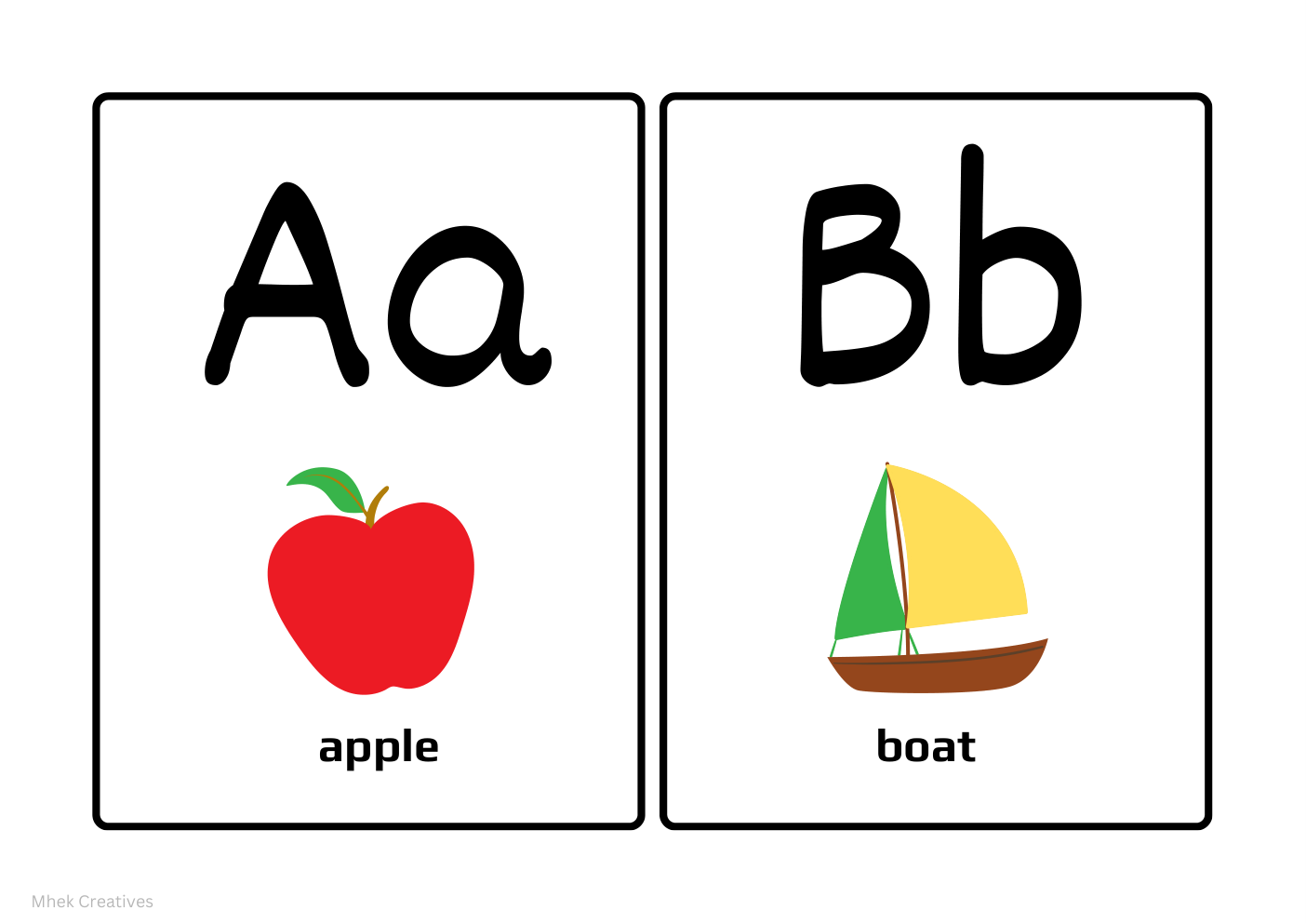 Alphabet Flashcards A4 Kategori: Flash Card Dasar • Untuk anak usia 3-4 Tahun apple boat A a B b Mhek Creatives cat dog C c D d Mhek Creatives Tag: creatives, mhek, alphabet, apple, boat, flashcards
